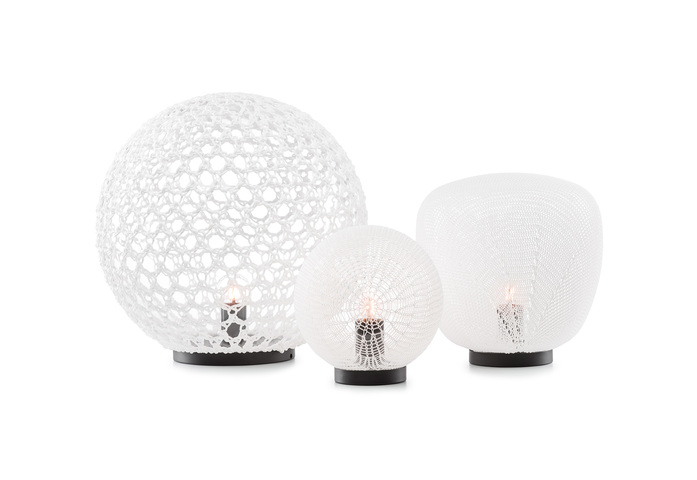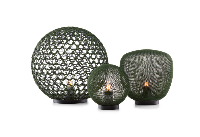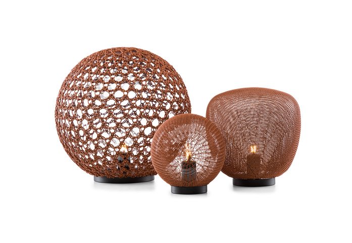 Monsieur Tricot ist eine Kollektion markanter gestrickter Outdoor-Beleuchtungskörper. Der belgische Designer Ilia Eckardt wuchs in der belgischen Modeszene auf und experimentierte mit innovativen Stricktechniken und witterungsbeständiger Schnur. Seine handgefertigten Kugel- und Tropfenleuchten verströmen eine warme Glut und werfen wunderschöne Schatten. Die unterschiedlichen Formen, Texturen und Farben stellen die perfekte Ergänzung zu den Möbeln von Tribù dar.