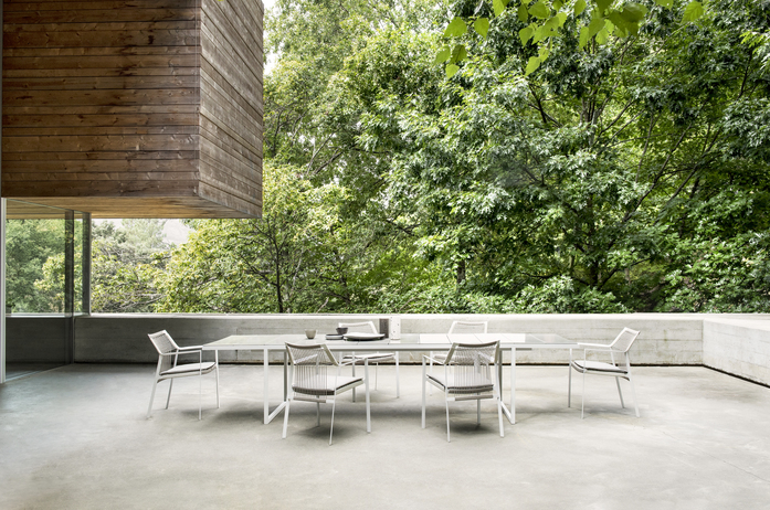 The airy Nodi chair can be excellently combined with the new Nox table that, with its generous length of 3.60 meters, offers space for generous company. The Nox table stands out with its handmade tabletop of glazed lava stone. Because beauty hides in imperfection, Tribù opted for a subtle craquelure effect. No tabletop is the same thanks to the natural imperfections in the reflective lava stone. The enamel layer makes the natural stone water, heat, frost, UV, and stain-resistant. The Nox tabletop rests on strong, slender supports made from powdercoated stainless steel. Thanks to this, the table is surprisingly light and elegant, despite the heavy stone tabletop.