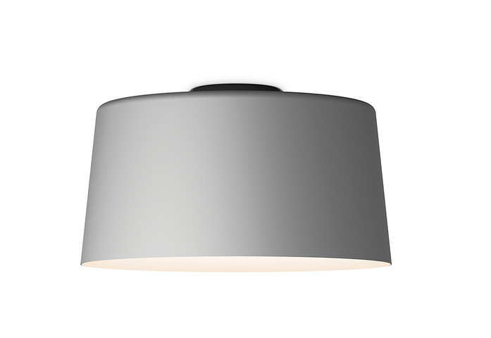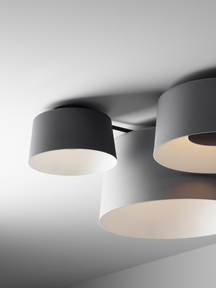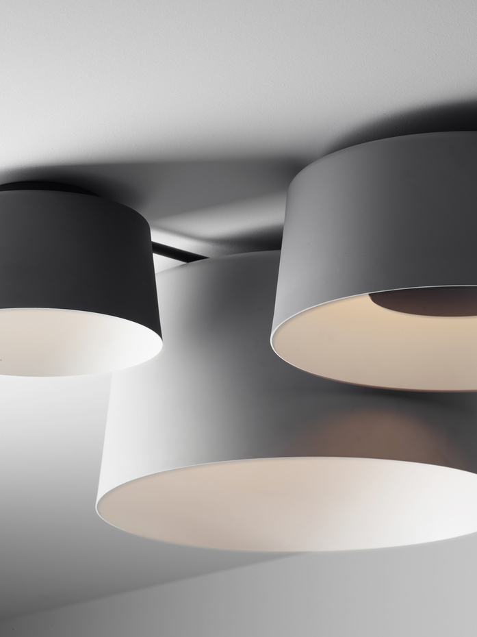Der urbane Geist von TUBE wird durch der Farbpalette der Aluminiumschirme in drei Grautönen unterstrichen: Hellgrau, Mittelgrau und Graphit, ergänzt durch gebrochenes Weiß. Die Kollektion spielt mit vier Schirmdurchmessern (22 bis 52 cm), vier Farbtönen und dem Rhythmus verschiedener Höhen.