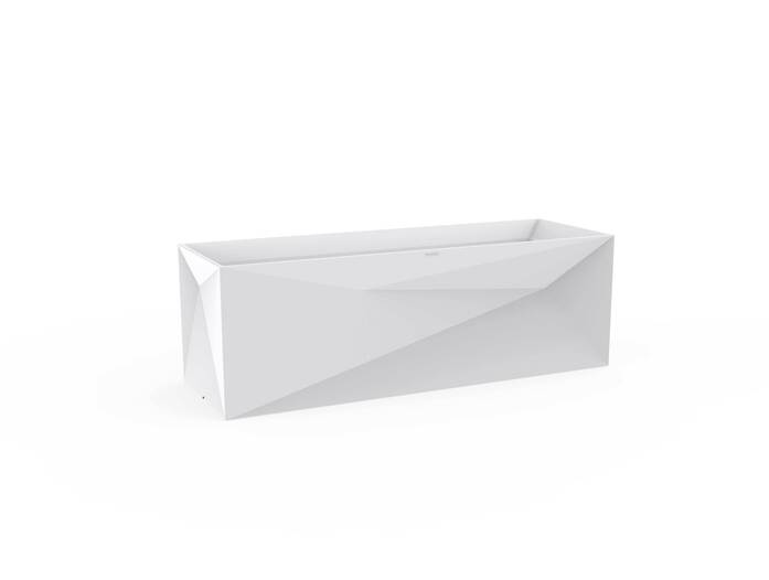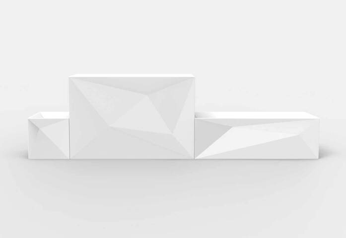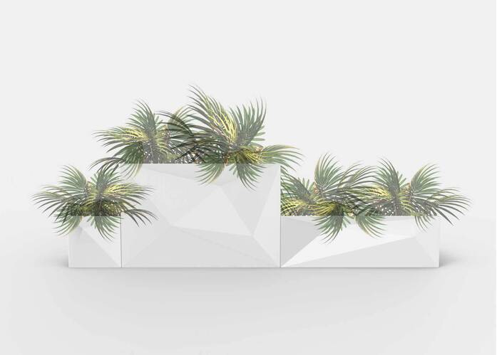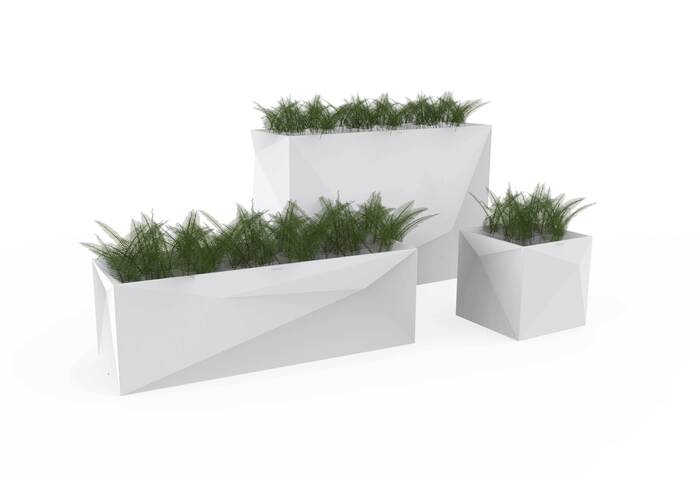 Pure geometry, in shapes of cubes and parallelepipeds, are fragmented creating faceted volumes. The result forms a setting in three different sizes. Their faceted sides, which are complementary, fit together to create groups and rows of flowerpots. This feature makes them versatile objects that can work perfectly in any space and also as dividing elements.