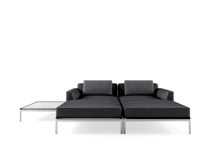AluZen comprises various elements (corner, chaise longue, pouf) which, when combined, allow for an infinite number of different configurations. A series of suspended accessories, interconnected with the structure of the sofa, are the precious details enabling a greater personalization of the composition. Coordinated with the system, there is a range of practical coffee tables with marble or laminate tops, characterized by the same structure as the sofa.