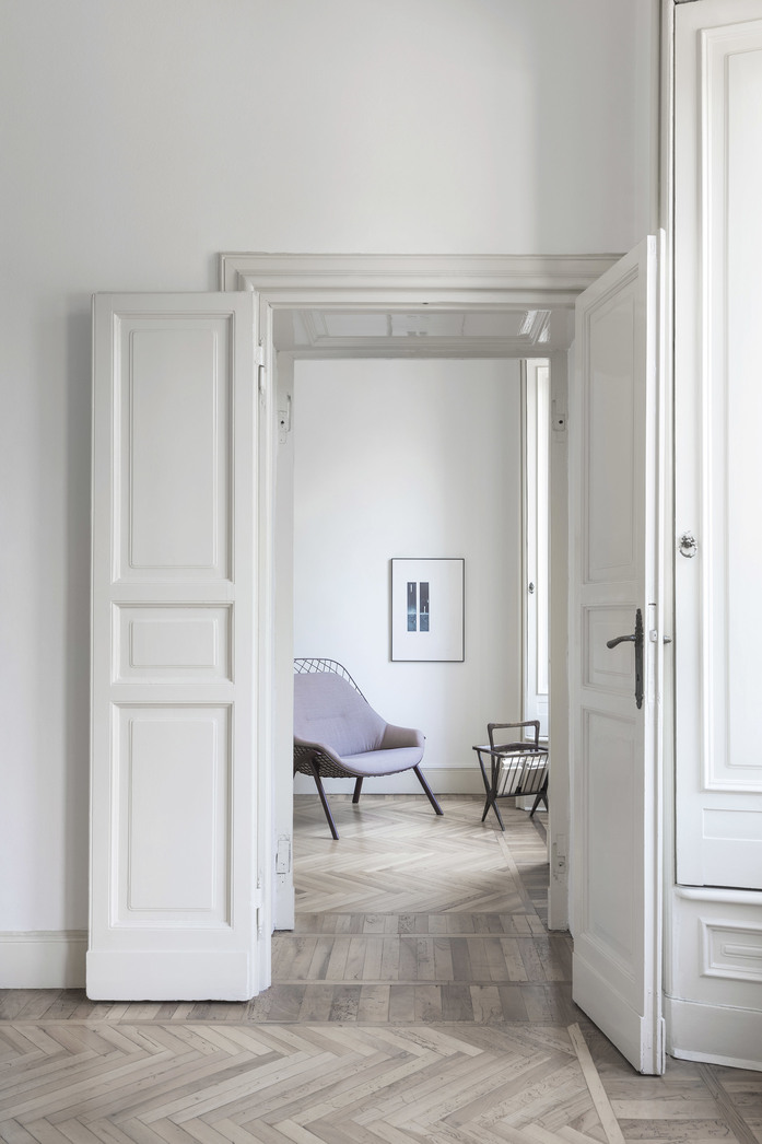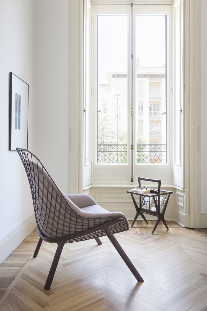 The gran kobi collection evolves naturally with the introduction of a wider base to allow for new uses. Gran kobi is a generously proportioned, low-slung armchair. A most versatile seat, perfect for a relaxing break. Ideal for use in domestic lounges and public waiting rooms, or even in informal office contexts, gran kobi is conducive to a relaxed attitude and guarantees maximum comfort. As the entire collection, also the shell of gran kobi is a sort of rigorous and enveloping basket, created by woven soldered round steel wire. The support belt, made from die-cast aluminium embraces the seat elegantly, totally enveloping the form. The structure consists of varnished aluminium support and legs and shell in the same color, available in different colors. A set of cushions completes the armchair: shaped to adhere perfectly to the shell and create a visual whole with the structure, they are upholstered in fabric to afford an extremely comfortable seating experience and the freedom of movement necessary to assume different positions. Gran Kobi completes the Alias range of upholstered products designed for domestic interiors and waiting rooms, also thanks to a pouf/bench endowed with a twofold function: to act as an element of comfort or a support for technological devices such as computers and tablets.