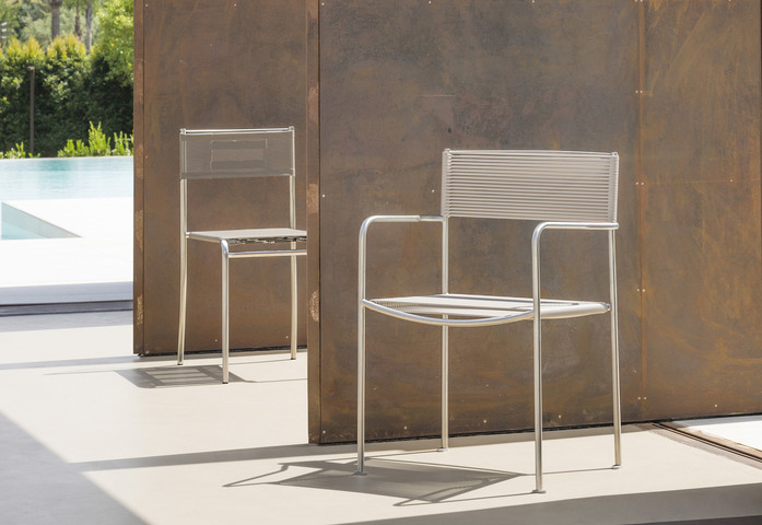 Stackable chair with armrests for outdoor, with brushed stainless steel structure; seat, backrest and armrests in ø5 mm PVC rod.