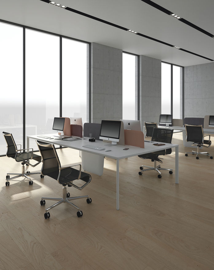 Particularly rich is the choice of finishes for the tables in the landscape system: an oak veneered or painted aluminium structure supports a top available in many variants: painted MDF, bilaminate or veneered plywood with solid wood edges; the sound absorbent panels, whether made of painted or fabric covered compact polyurethane, or made of solid wood, are a perfect match for the structures they are rested on, creating an unexpected skyline.