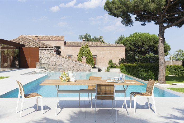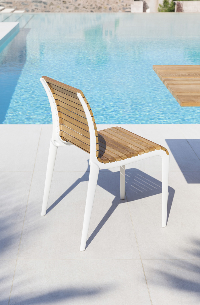 The chairs in the Teak ensemble are practical, stackable and with a lightweight aluminium frame, and use wood for the surfaces that design the seat and backrest: the teak lists hollow out in the lumbar support area and the seat, thus adding elasticity, ergonomics and comfort. The tables – rectangular and available in two sizes – are made up of structural components in aluminium and a top with characteristic teak lists.Resistant over time and pleasant to the touch, they are suitable for outdoor areas of gardens and add solidity and attention to detail to the Outdoor collections.