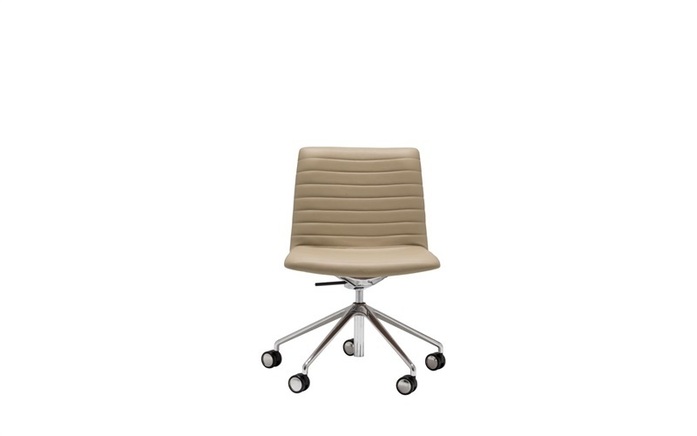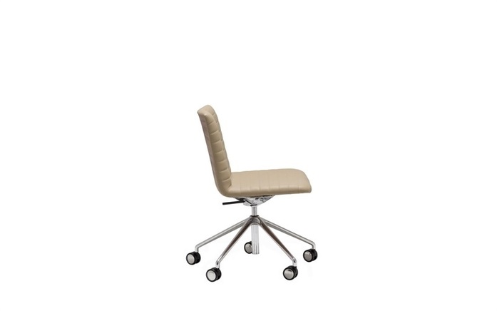 Low back armchair with upholstered shell and height adjustable central swivel base with 5 casters and self-return finished in polished aluminum, white or black. Additional options include: parallel upholstery stitching, upholstered arms, tilt mechanism and back finished in walnut veneer.