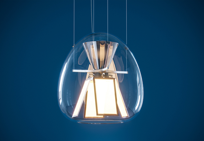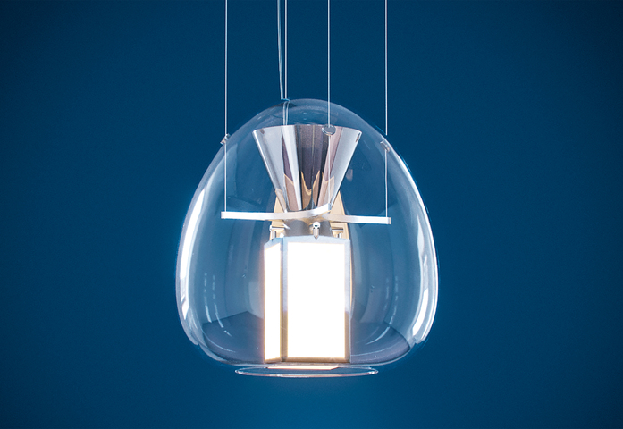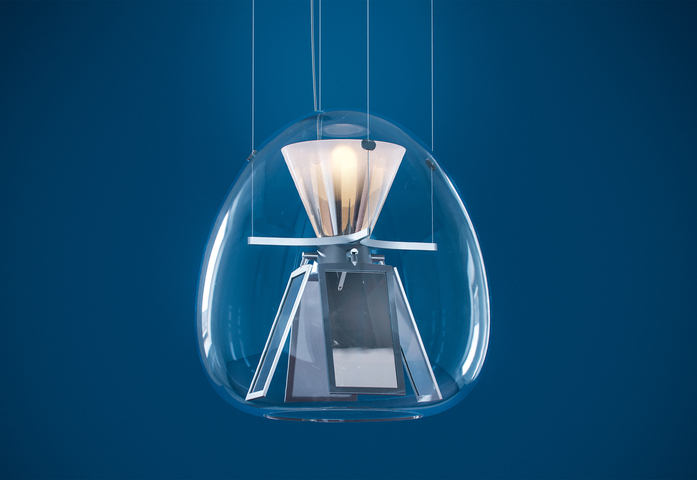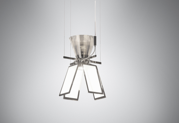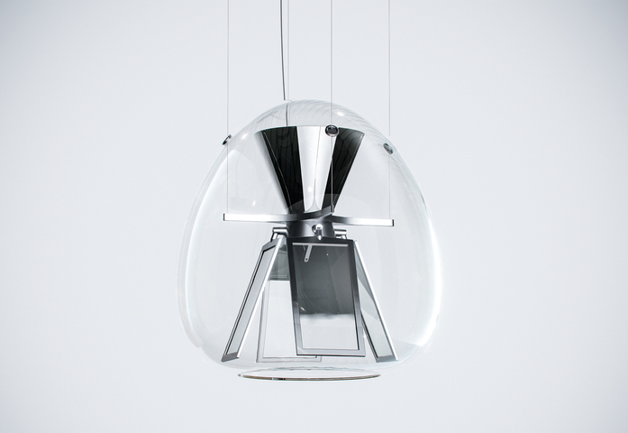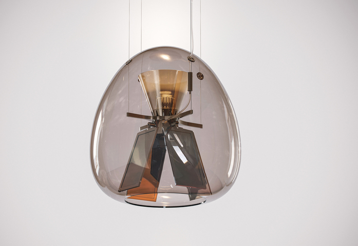 Harry H., a hybrid optical device, represents a change of the light design paradigm. As with LED it was crucial to design without any biases connected with the use of traditional sources, OLED technology has very specific characteristics that make it quite different from previous ones. The product is a thorough review of light that starts from the features of this new OLED technology. It is an open system that breaks with tradition, a hybrid system that brings together the LED and the OLED to make the most of both technologies, combining them to provide the best possible performance for man and his needs. It is an interpretation of the most advanced technology combined with the tradition of hand blown-glass. Within the soft geometry of a blown glass diffuser, two separate optical devices are developed and work together to provide a light quality suited to design different scenarios and to ensure top performance. The bottom features four pairs of adjustable OLED panels that emit from from both sides and generate convergence between the source and the reflector. When turned off, the panels are a mirrored surface that reflects its surroundings and the light emitted by the top LED source. The upper optical unit starts from the emission of a COB LED and works across geometries, materials, and innovative finishes to control and diffuse light throughout the environment, mainly sideways and for a small portion indirectly.