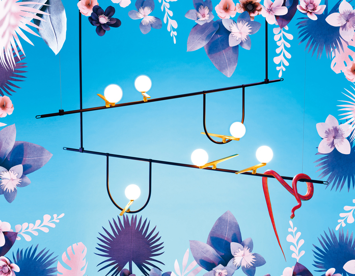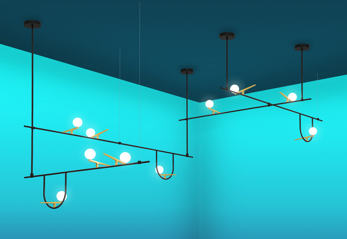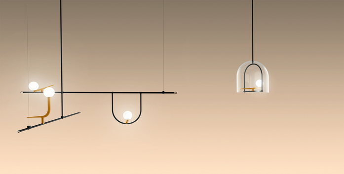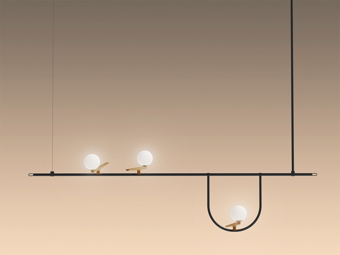 The activity of Neri&Hu is founded on constant research and the desire to work on the dynamic interaction of experience, detail, material, shape, and light, rather than adapt to stereotyped formulas. In a blend of tradition and innovation, Yanzi is a lightweight composition of graphic signs. Balanced structures, such as branches or perches, support multiple stylized figures to provide a variety of versions and qualities of light. They are iconic swallows with a brushed brass body, with their head like a white glass sphere enclosing light, either flying free or contained in glass cages. There is unique sensibility in matching warm and cold, essential yet refined materials. Yanzi is an open system, ideal for creating lightweight compositions and light landscapes that animate any space with an elegant poetic attitude.