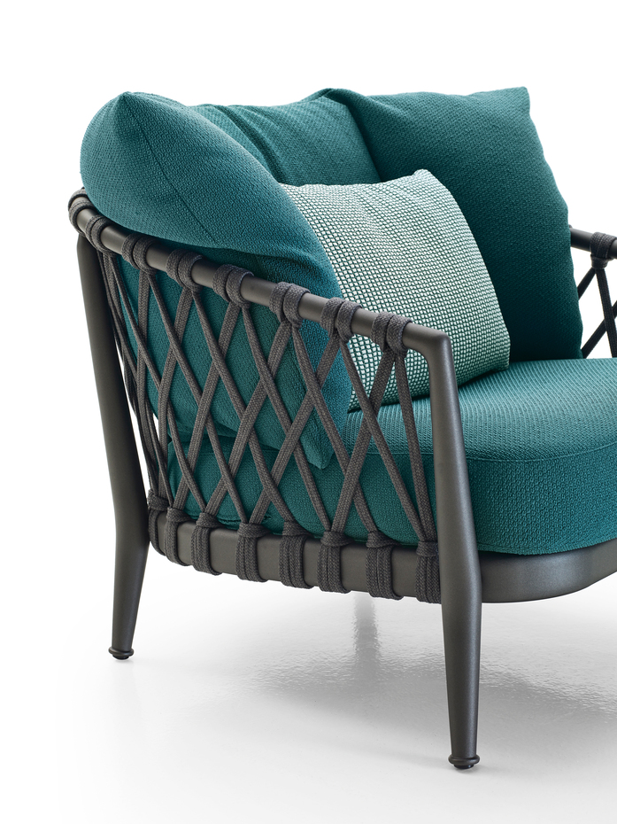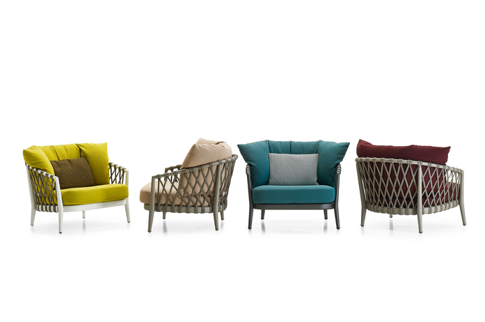 A new series made up of armchair, sofa and chair, even in a stackable version, whose lightness and design, complying with ergonomic and environmental adaptability criteria, make them suitable for use both in public and residential settings. The structures, made of a technological blend of extruded and die-cast aluminium elements, are combined with special high resistance synthetic fabric interlacing that have been studied for outdoor use. The collection revolves around three basic colours - white, dove grey, anthracite - which offer the following combinations: white for the structure with dove grey for the interlacing, dove grey both for the structure and the interlacing, anthracite for the structure and the interlacing. Soft seat and back cushions, in a wide range of colours, complete the seats and guarantee a comfortable relax.
