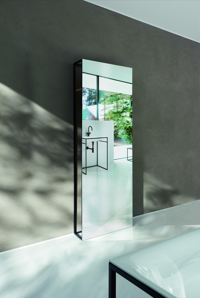 Like the BetteLux Shape baths and washbasins, the generous mirror is supported by a frame of powder-coated steel. The mirror conceals a shelf and a hook for bathing textiles.