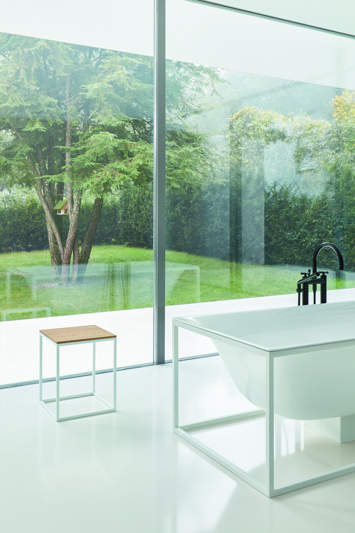 Shelves, towel holders and a stool are also available in the same design as the BetteLux Shape baths and washbasins. The frames are made of powder-coated steel, the flat elements of real wood.