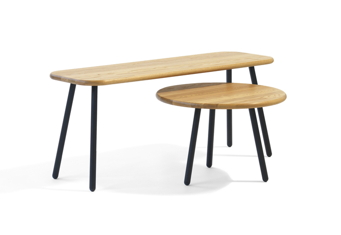 The Kaffe family is equally at home indoors and outdoors. The tables in solid oak and valchromat are for indoor use only. There is also a table entirely in steel for outdoor use. If required, the table can easily be dismantled. The Kaffe tables come with a round or square tabletop and are available in a choice of heights. The Kaffe family comprises chair, easy chair, sofa and table.
