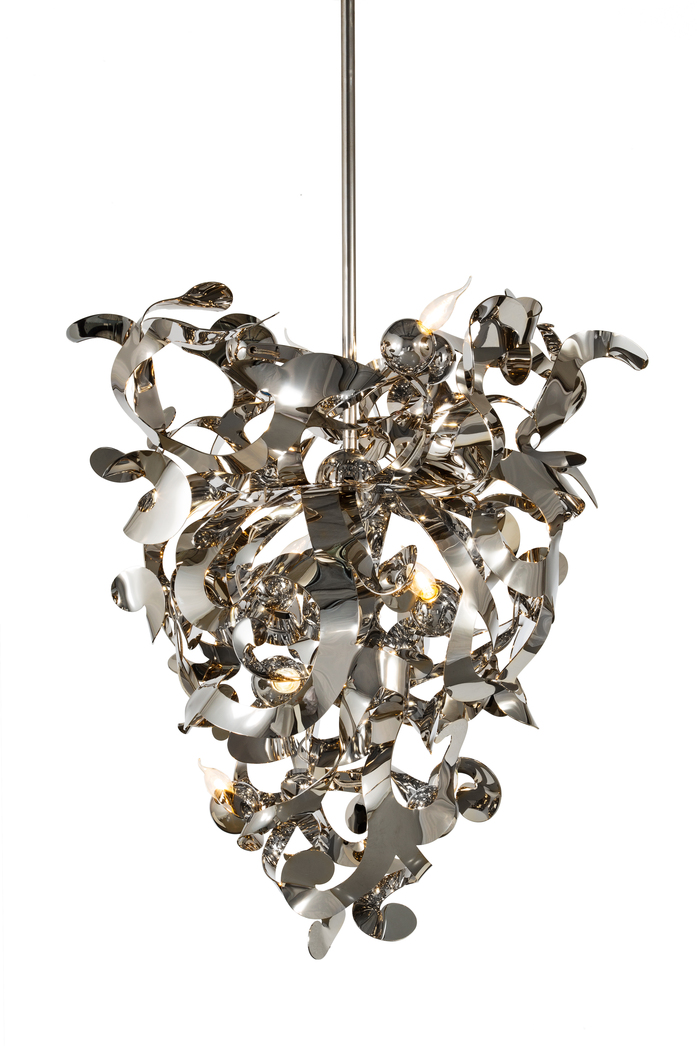 Frivolous and light-hearted, spirited and energetic; the arched and curved KELP dances through the air. The light sparkles warmly as in a crackling open fire, bringing an exhilarating sense to any space.