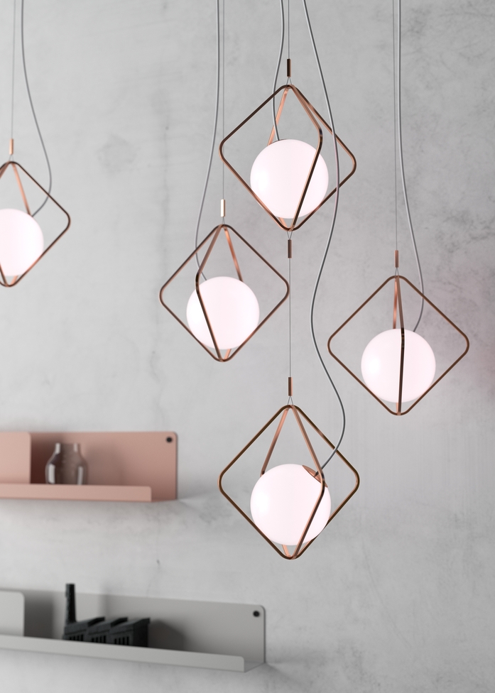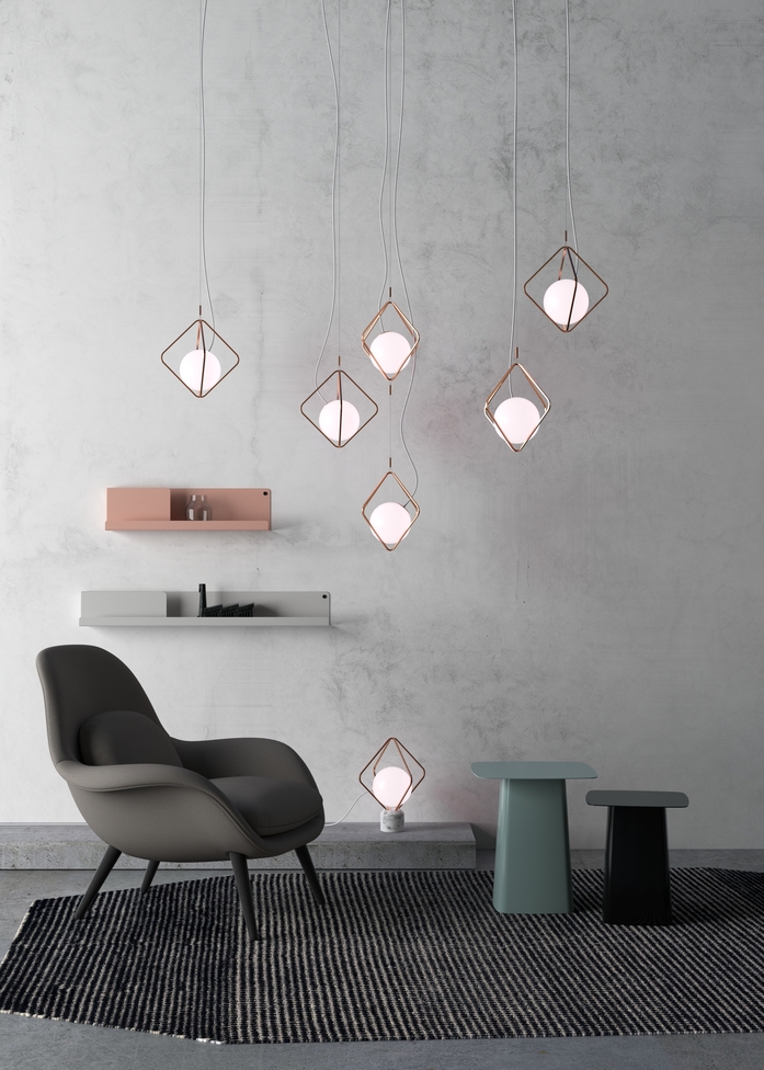 Light as a jewel of the home. A functional object in aesthetic elation, a sentinel of the evening and the night. The subtle levitating metal frame bears tidings of the way and a luminous pearl in the form of a handblown matte sphere. This geometrically balanced light offers a wide variety of combinations. It can be hung separately or in vertical lighting arrangements.In addition to the suspension variant, there is also a wall composition of 5 frames and table version.