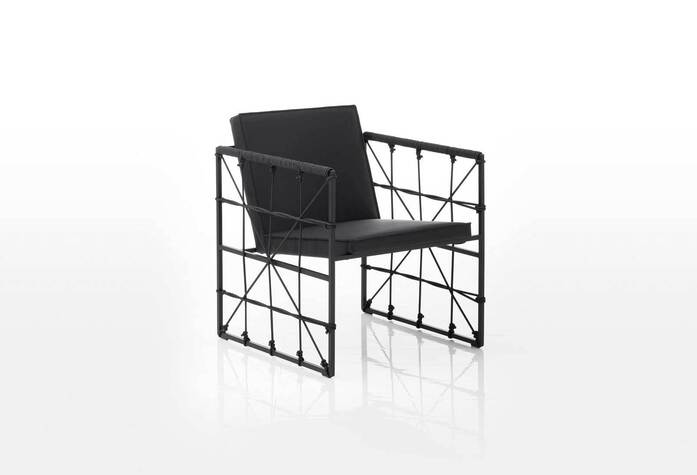 Grace bungee complements the range of grace armchairs with a version with handwoven bungee cord detailing at the armrests. The armrest tops are wrapped in bungee cords – thus also functioning as armrest pads. Additionally, the frame is decorated with several horizontally stretched cords.