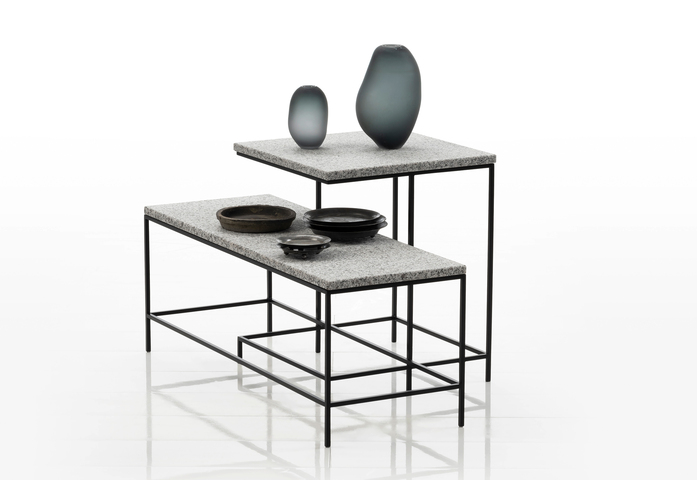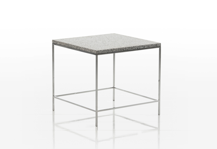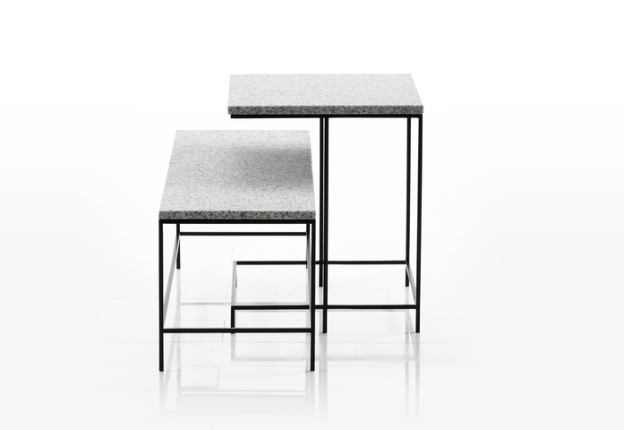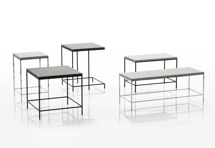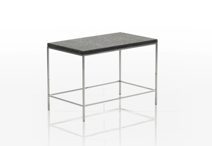 The filigree occasional tables tray are offered in a variety of versions: rectangular, square, and with different dimensions and heights as well as with a light or dark granite top. Thus, the perfect individual table can easily be found or, alternatively, several tables can be arranged into airy ensembles. The very graceful, precisely crafted bases, black powder-coated or in chrome, give the tray tables a fine, graphic and elegant effect. The higher square table with the cantilevered top can be pulled either over the seat base of a chair or sofa or over one of the lower tables.