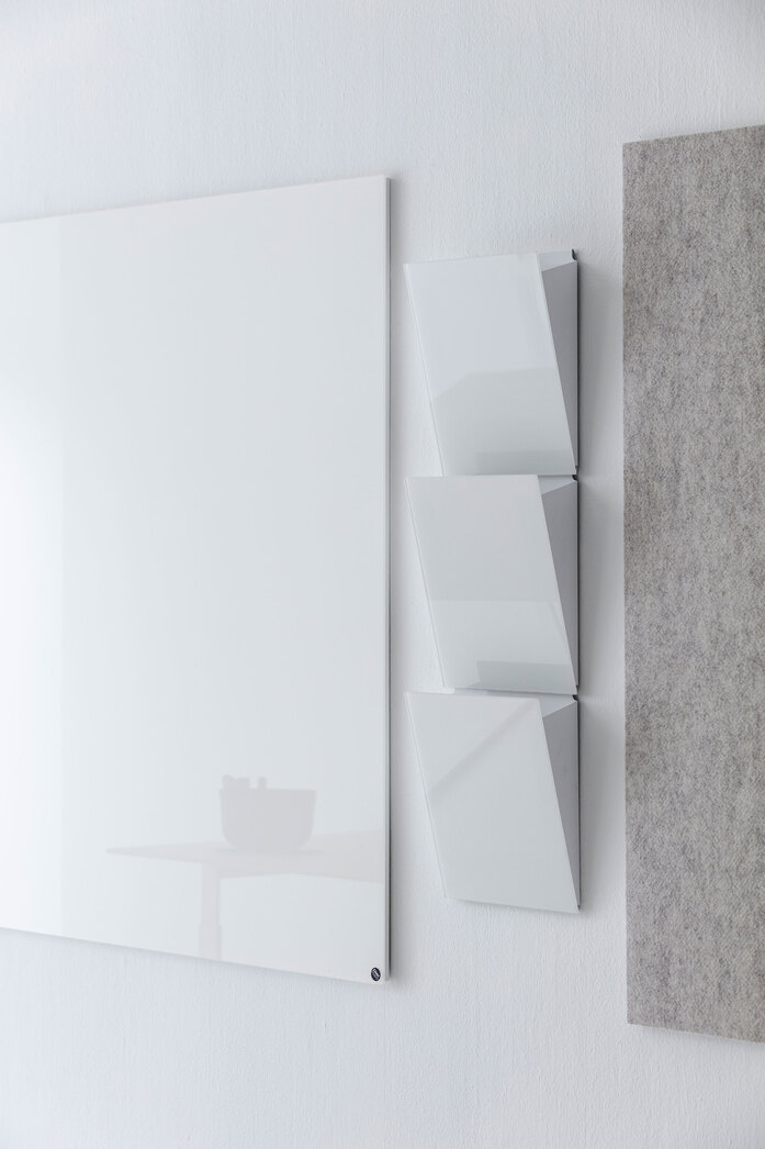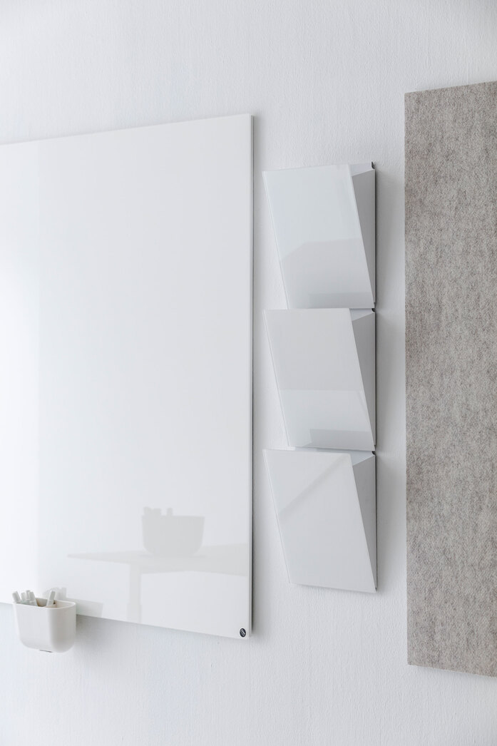 wall-mounted magazine rack with writable glass front, W 26 x H 31.5 x D 9.8 cm / W 10.24" x H 12.40" x D 3.86" - available in 25 standard glass colours