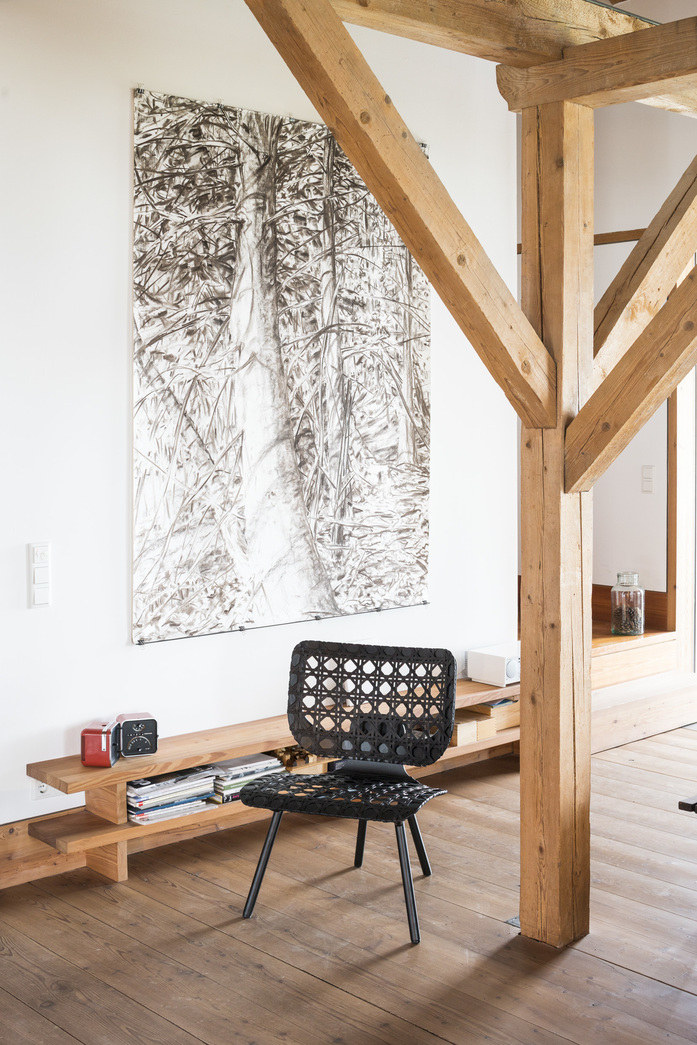 The high sitting comfort results from the leather straps stretched on a wooden frame. Similar to the leather stretched on a drum, the result is flexing minimal surfaces absorbing the movements of the body and making sitting and leaning back especially comfortable. High-quality craftsmanship skills are required for executing the traditional weaving technique in this format with leather straps. The graphic appearance of the pattern is enhanced by the optional use of leather in two different colours.