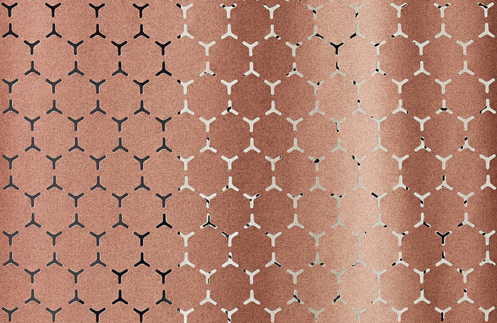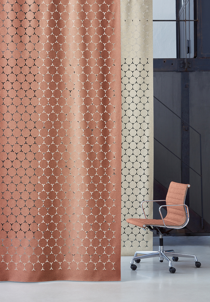 Two-sided curtain divider with laser design in Trevira CS. The mottled and napped quality with wool cloth like characteristics features on one side a digital print and therefore has two attractive and different sides. The laser design displays a timeless allover pattern with hexagons. Calvino Forma looks like an architectural ornament and generates interesting light and shadow displays. It is perfect as an eye-catcher and as a room divider for zoning or sub dividing of interiors in both the contract and the private sector. It is available in five elegant, muted colour options.