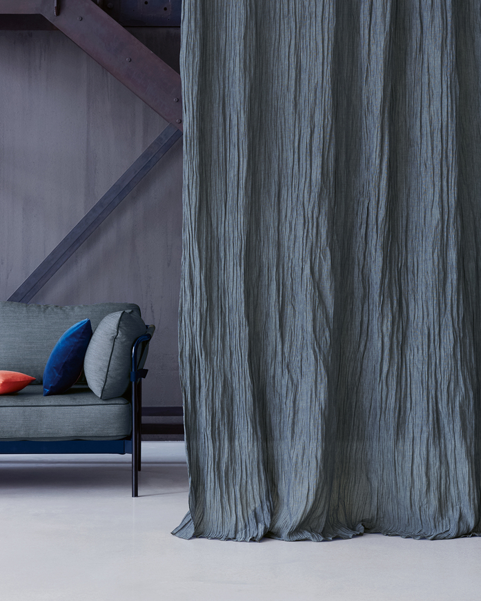Semi-transparent curtain fabric; The in the warp direction crushed article combines in the weft cotton with a delicate metal yarn. Its irregular creasing, soft volume and matt look bestow natural, understated charm to the item. Cascade lends interiors a casual and relaxed ambiance.