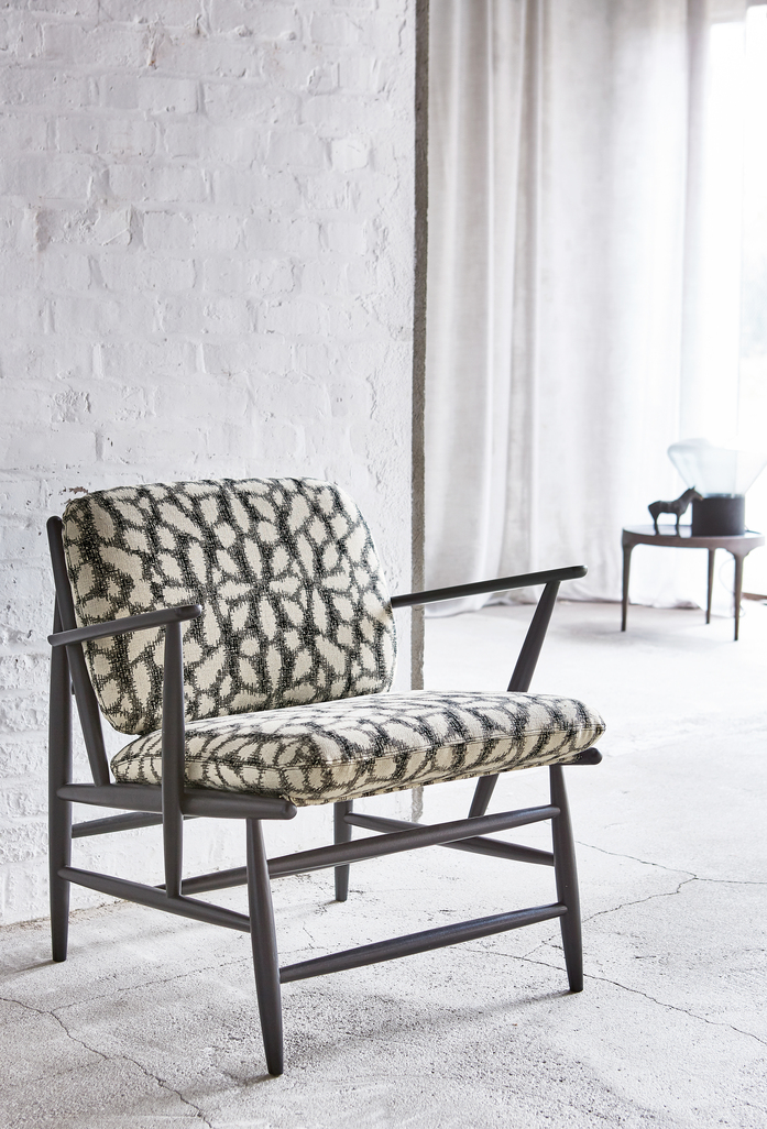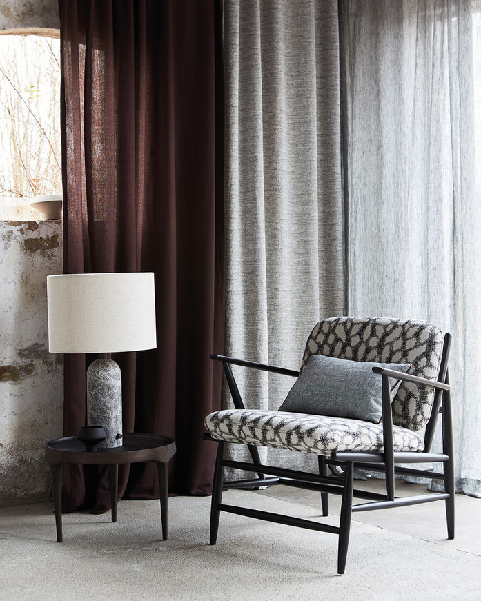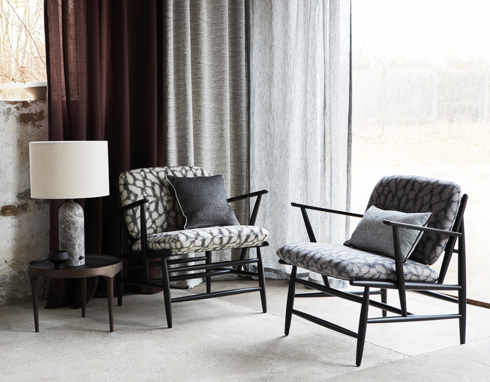 Upholstery fabric with a formation based ornamental design. Leaf l ike shapes group together into stylised blooms to disperse again in the area. The look akin to roughly shaded sections in a drawing derives from the skilful use of the Jacquard technique. Floras sets accents in interiors and flirts subtly with ethno charm. Striking colour settings in black/white are supplemented with subtle colour combinations in pink/grey and sage/silver.