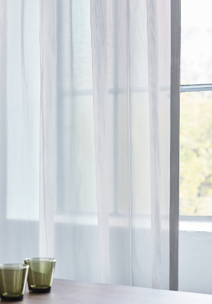 Transparent acoustic curtain fabric; The flame-retardant, highly sheer textile absorbs sound through being three-dimensional but still lets a lot of light into the room. The combination of matt and shine results in an enticing interplay at the window and the relief like rib on the facing side emits a modern and timeless presence. Megacoustic captivates with pure aesthetics; it is suitable for anywhere where along with interior acoustics the provision of natural light is in focus.