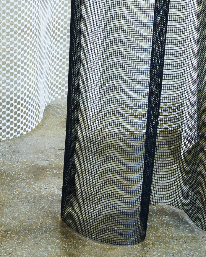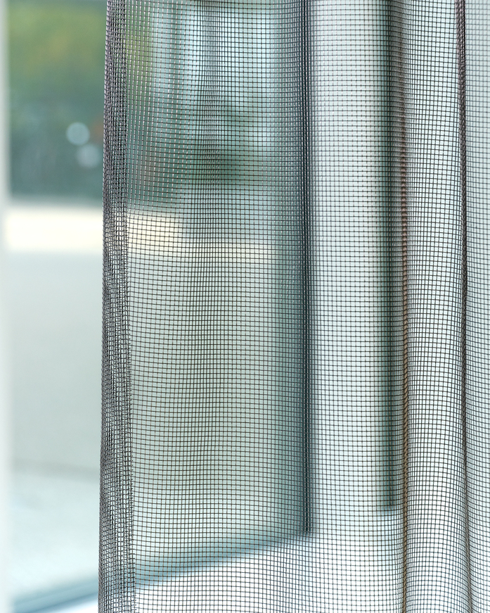 Classic two-sided knit fabric with a square net look in a plain and simple architectural style. Elaborate manufacturing techniques and use of shiny filament yarns lend the curtain fabric a futuristic air.