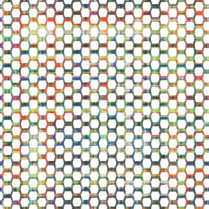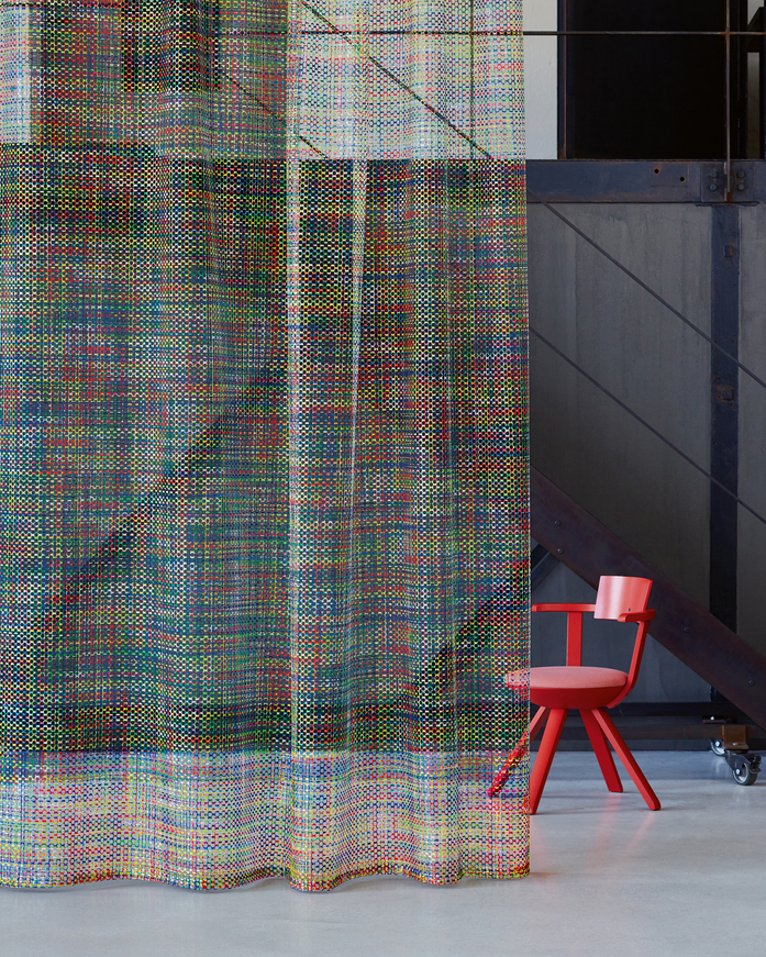 Transparent curtain fabric with allover print in Trevira CS. The sophisticated, multi-coloured texture is printed onto Globe quality, a striking knit fabric which the print transforms into an extravagant net.