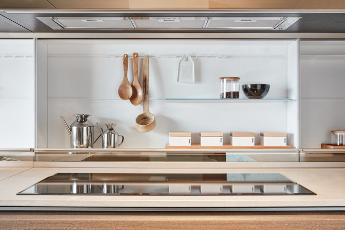 Now there are fully equipped back panels: the new space between wall units and worktop can be concealed by sliding the glass doors, with a mechanism patented by Dada. The LED lights and power socket units transform the back panel into the technological soul of Trim.