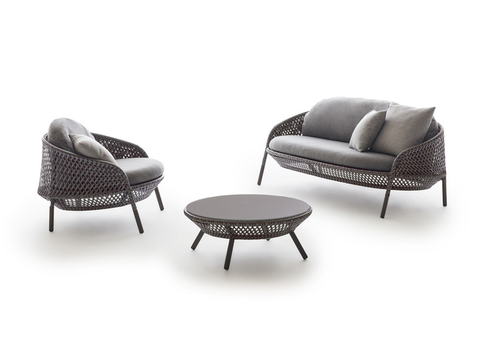 With AHNDA, Stephen Burks has a created another DEDON first — an outdoor lounger with all of the iconic style, ergonomic comfort and luxurious attention to detail that one expects of the finest indoor pieces. Available in wing and lounge chair versions, AHNDA strikes you immediately with its looks, the designer having immersed himself in the rich weaving culture of the Philippines to develop the chair’s signature open weave. Created with weatherproof DEDON fiber, this ‘transparent upholstery’ conveys a feeling of breezy lightness, while ANDHA’s articulated structure, clearly visible underneath, signals a fresh approach to classic lounger design. As you inspect it more closely, AHNDA reveals a level of detail typically associated with a collector’s piece. Knurling on the reinforced aluminum legs, for example, echoes AHNDA’s signature woven pattern, as does a zig-zag stitch on the headrest. A stunning example of the craftsmanship of DEDON’s master weavers, the woven pattern itself consists of three shades of red fiber, giving AHNDA a subtle yet alluring vibrancy.