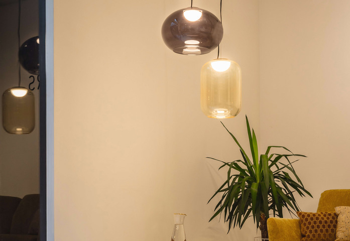 Our search for a more present and flamboyant suspension resulted into a co-operation with master glass blowers, with whom we worked on the balance between object and light, between subtle colours, densities and transparencies. The result is Mello. When turned off, its colours gain definition; when turned on, they disappear with gentle luminosity. The Mello offers a sense of special intimacy with direct light on its below surfaces. At the same time enhancing the space with warmth, elegance and transparencies.