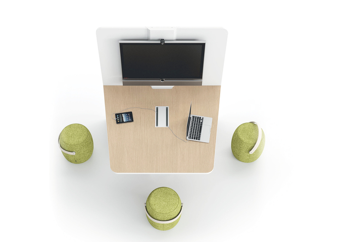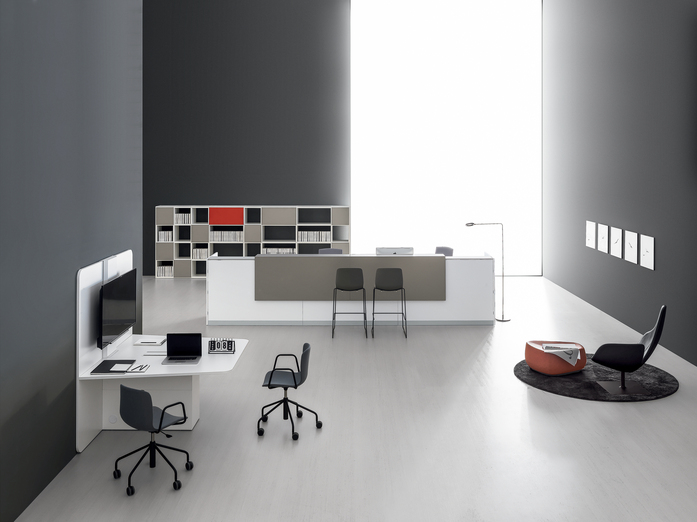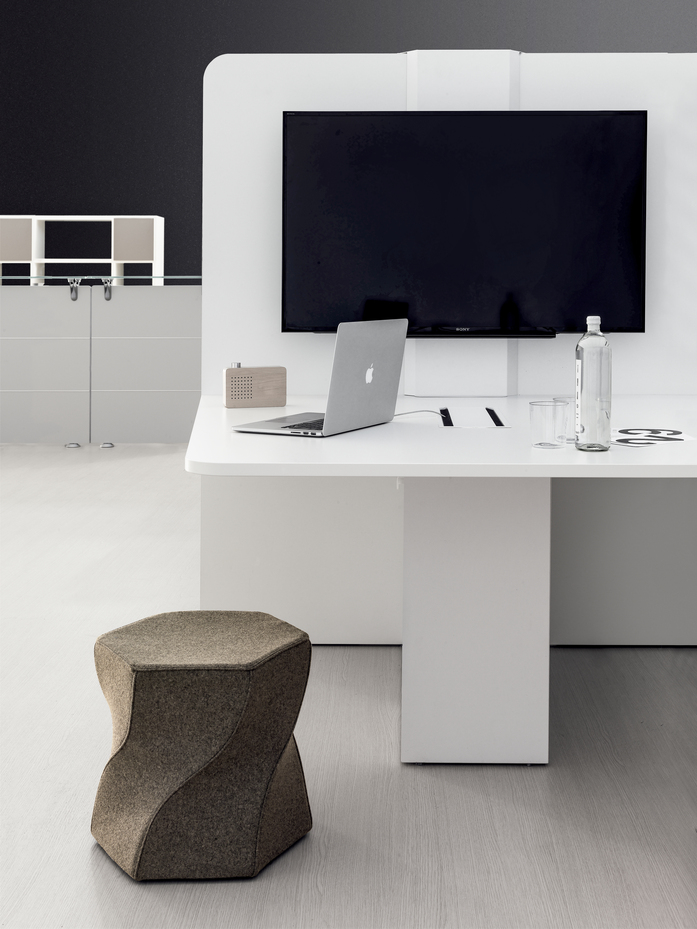 WORKTOP: Available in height 74 cm or 107 cm.It is made of 25 mm thick wood conglomerate coated with white melamine, light grey, light oak, dark oak, tobacco oak, walnut, umberor black mat melamine, with 2 mm thick ABS edge profiles or with matching colour or white. Trapezoidal shape with 2 rounded corners,80 mm radius. The worktop is equipped with a central top-access with openable door on two sides to permit the exit of the cables onthe work surface.