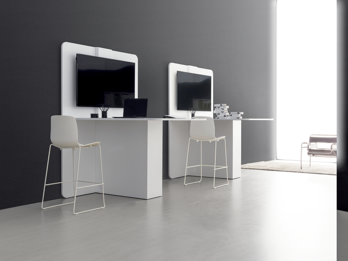 BACK PANEL: Made of 25 mm thick wood conglomerate coated with white melamine, light grey, light oak, dark oak, tobacco oak, walnut, umber orblack mat melamine, with 2 mm thick ABS edge profiles or with matching color or white. Rounded corners, 80 mm radius. Standardlevelling feet made of ABS 10 mm h., or 20 mm h. on demand, in case a better cooling of the electronic parts it is needed.At the back panel a casing of bent metal sheet 1.5 mm thick painted white, aluminum or anthracite is attached; it is prepared for wiremanagement and for the fastening of monitor and webcam.