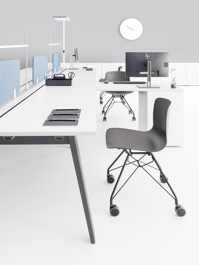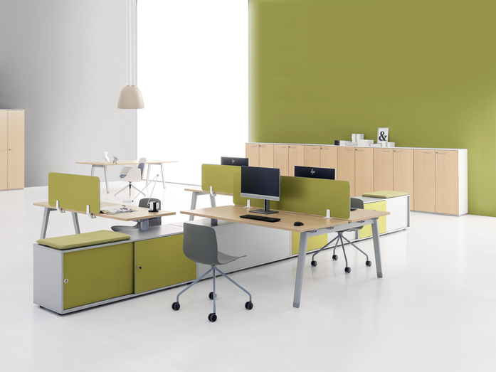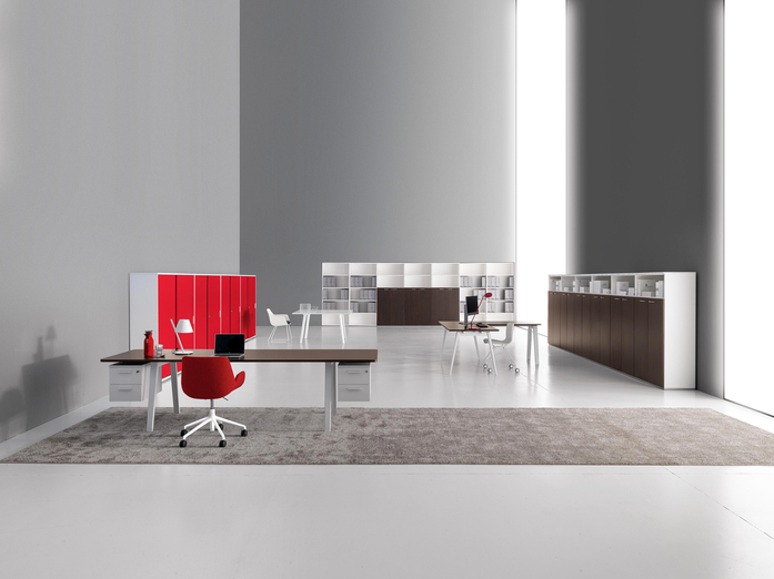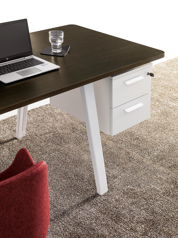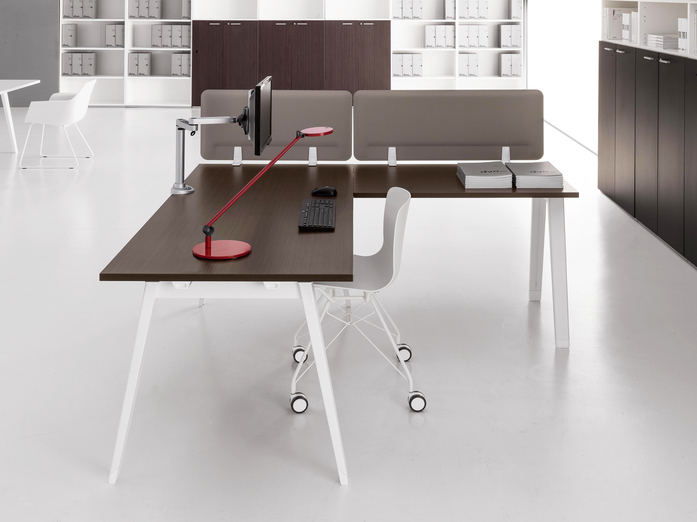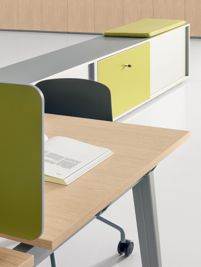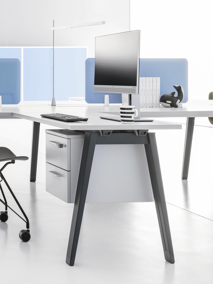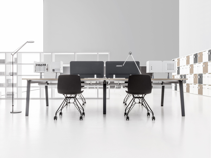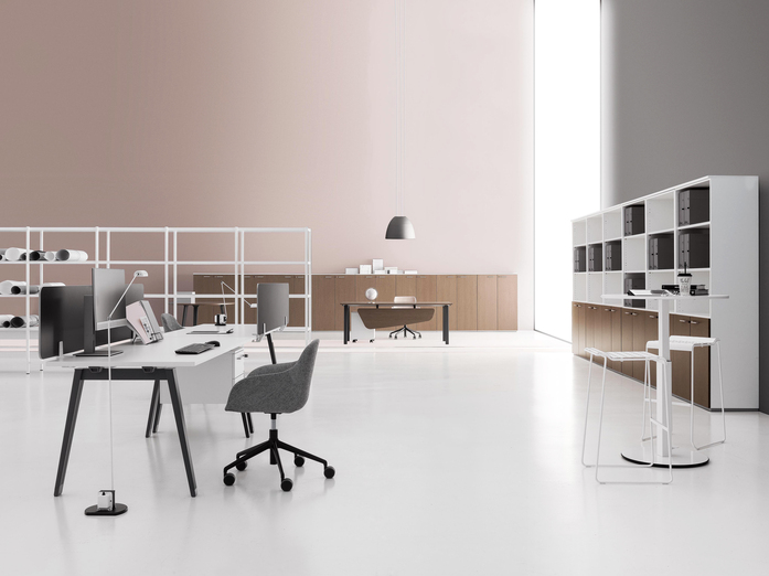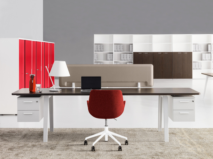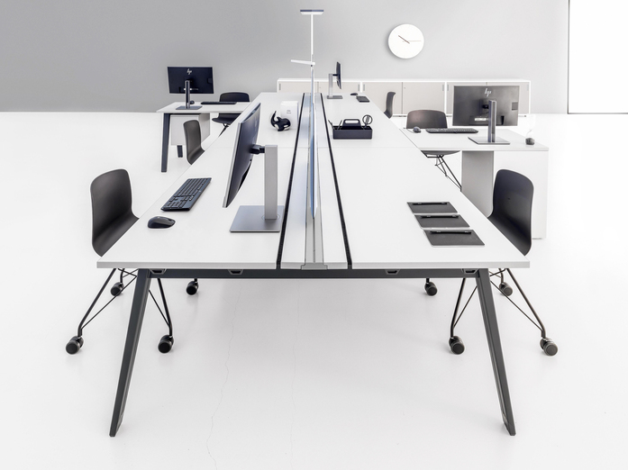 New furnishing solutions for workstations. Versatile, fresh styled and functional, a range with an extremely easy assembly system. This series fully furnishes operative and executive spaces, in line with today’s work evolutions. Formal lightness and style are the main ingredients of an operational system characterized by tables with trestle legs, in single or bench version.