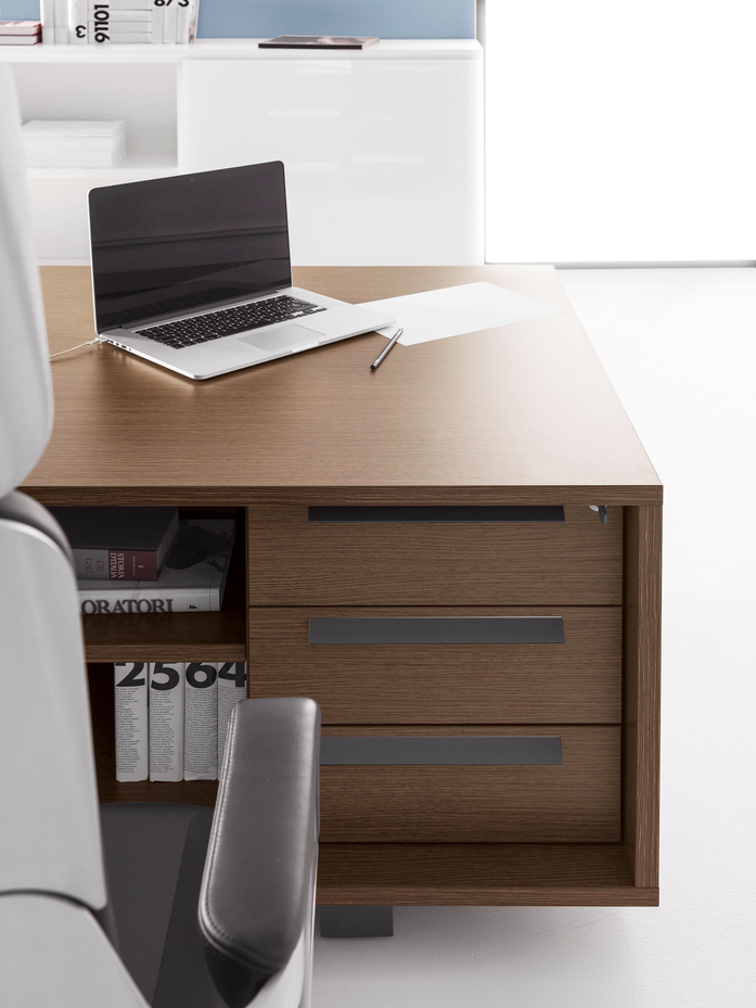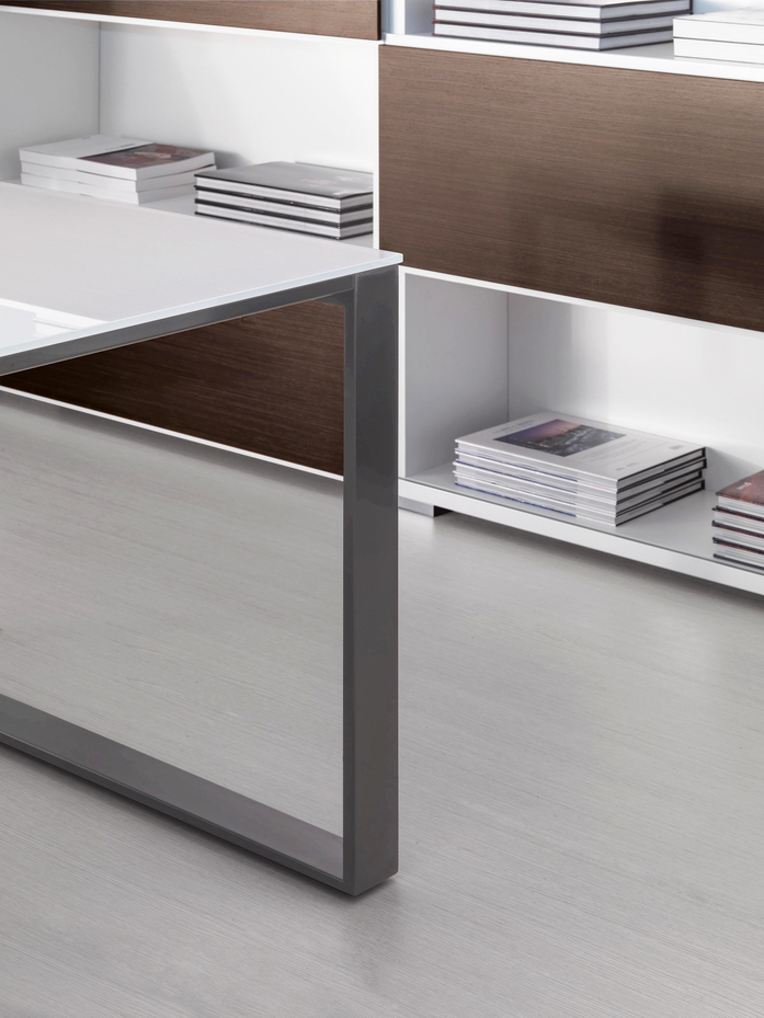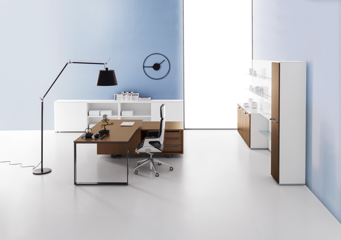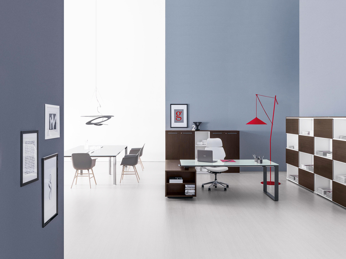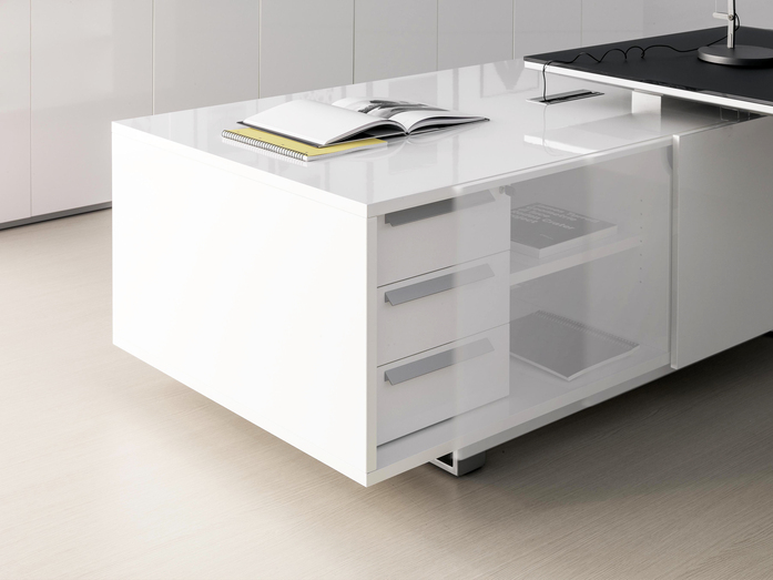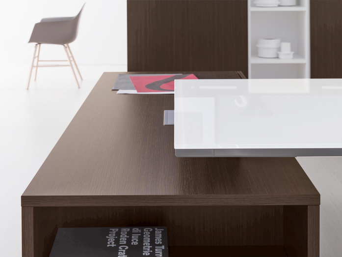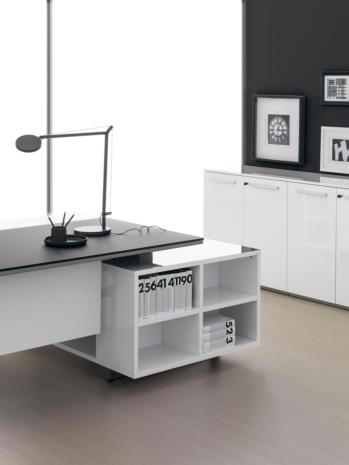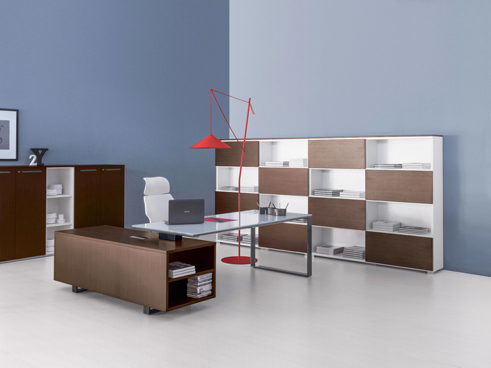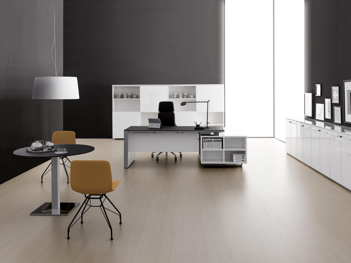 Elegance of volumes. Cozy and comfortable collection, exalted through a number of available colors and finishes that make this series alive and timeless. This elegant, minimalistic executive range stands out for functionality and for the different depths of the carrying service units. Meeting tables, pedestals and universal storage units complete the collection.