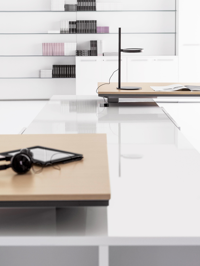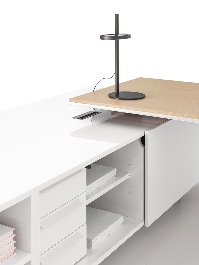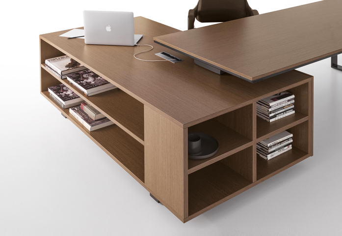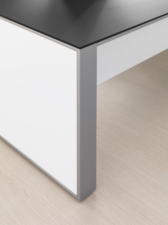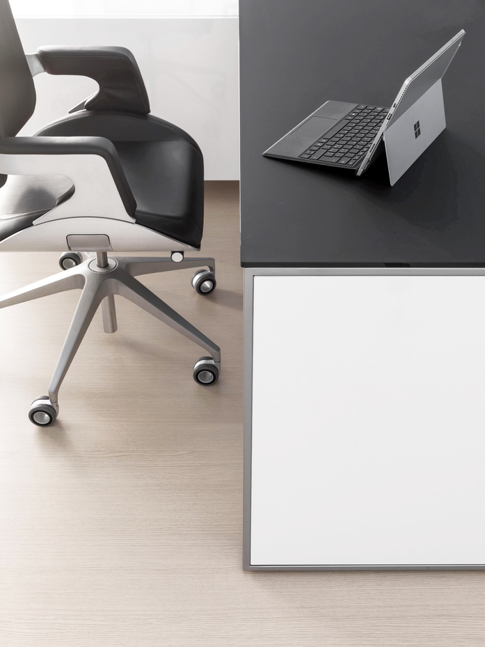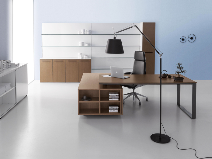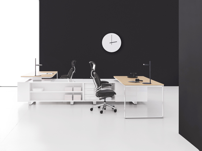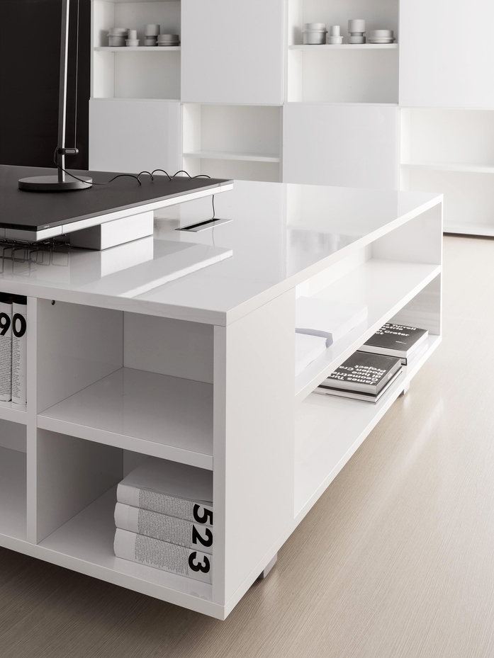 Elegance of volumes. Cozy and comfortable collection, exalted through a number of available colors and finishes that make this series alive and timeless. This elegant, minimalistic executive range stands out for functionality and for the different depths of the carrying service units. Meeting tables, pedestals and universal storage units complete the collection.