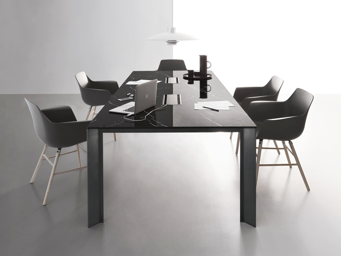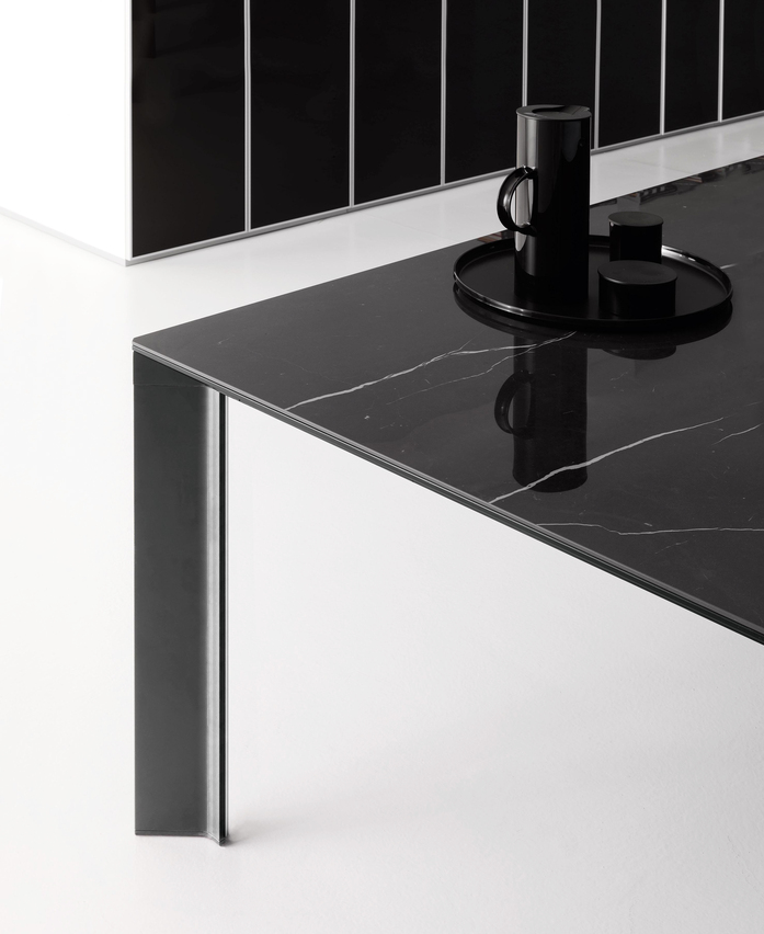 The DV903 series enriches its finish options with the new “porcelain stoneware” tables, in the “extra-white” and black “marquinia” versions.