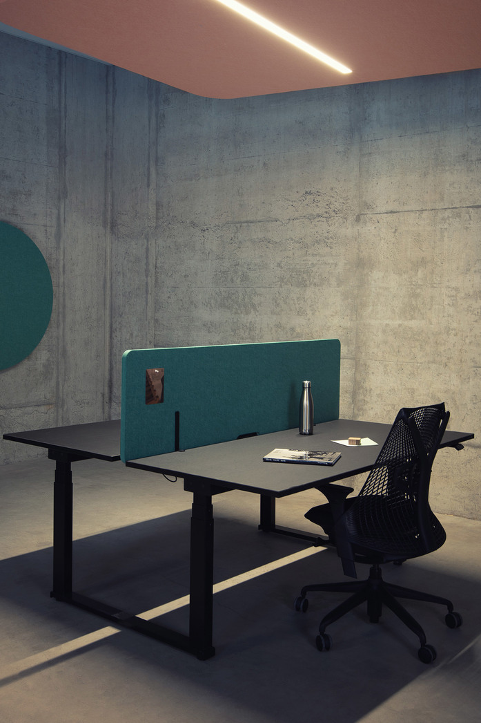 The minimalistic design reflects the manufacturer’s mission to pursue the idea of dematerialisation and functionality. The high density of the light-weight material allows a frameless construction, however, is not suitable for carrying heavy loads. ECHOJAZZ reduces the carbon footprint by over 60% by avoiding MDF and aluminium that conventional products use. The products are suitable for pinning and available in two standard heights, four lengths and three perforation designs. However, the product is extremely adoptable to any size desired. The standard adapters allows the installation to table tops from 16mm to 75mm thickness. The installation is quick and tool-free.