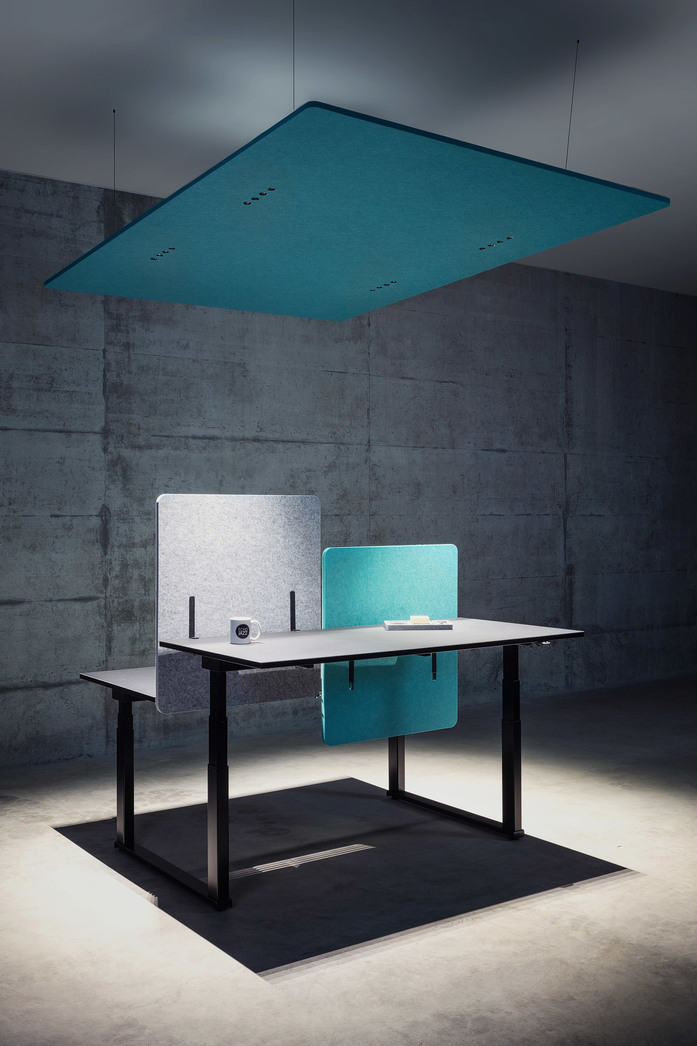 The "EchoLED® Double L" (180 x 238cm) with two light modules is used for optimum illumination of two opposite workstations. The acoustic sail overlaps the worktable by approx. 40cm so that the working area is completely covered. The ideal distance between the tabletop and the light source is more than 170cm - the strongly directional luminaire is not suitable for very low rooms.