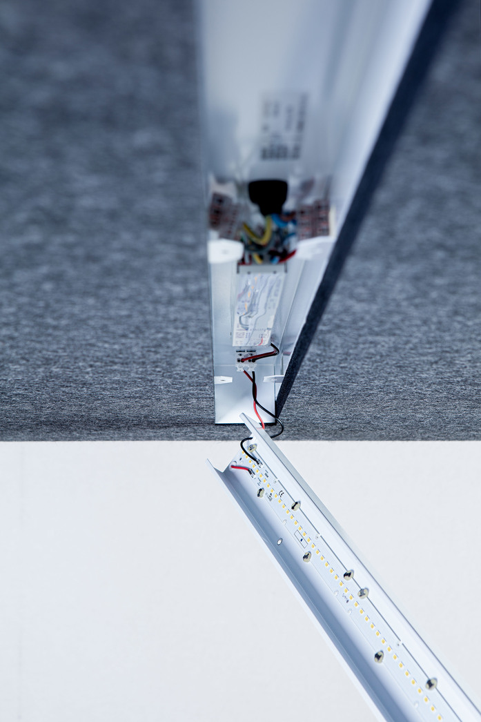 Swiss engineered and manufactured high performance workplace lighting solution that convinces in every single point: quality of light, functionality, longevity, maintenance, energy efficiency, acoustic performance and price. Together with a team of lighting consultants, ECHOAZZ created a modular design to guarantee adoption of future lighting technologies so that the sail and housing can be recycled and never get old. In addition, all maintenance work can be carried out without dismantling the acoustic sails.