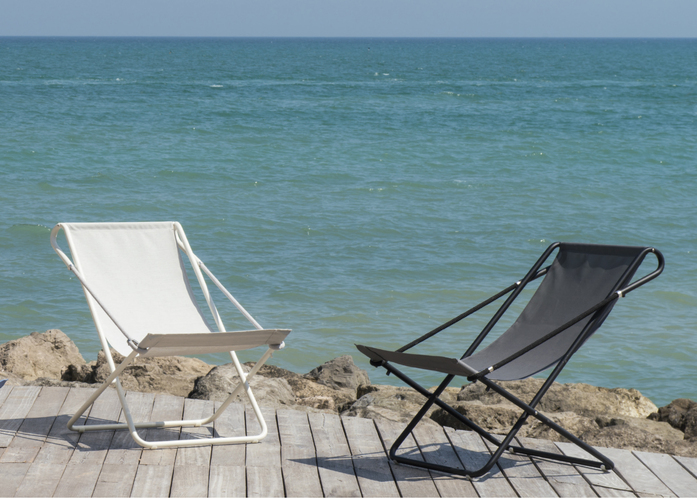 Simple and original, this new deck chair stands out for the steel tube frame that folds over itself as though all of it were made of the thick rope that then fastens at the lower end, while a slot device provides the backrest with two different positions. The frame is enhanced with two-tone outdoor batyline Ferrari fabric and a handy matching head rest.