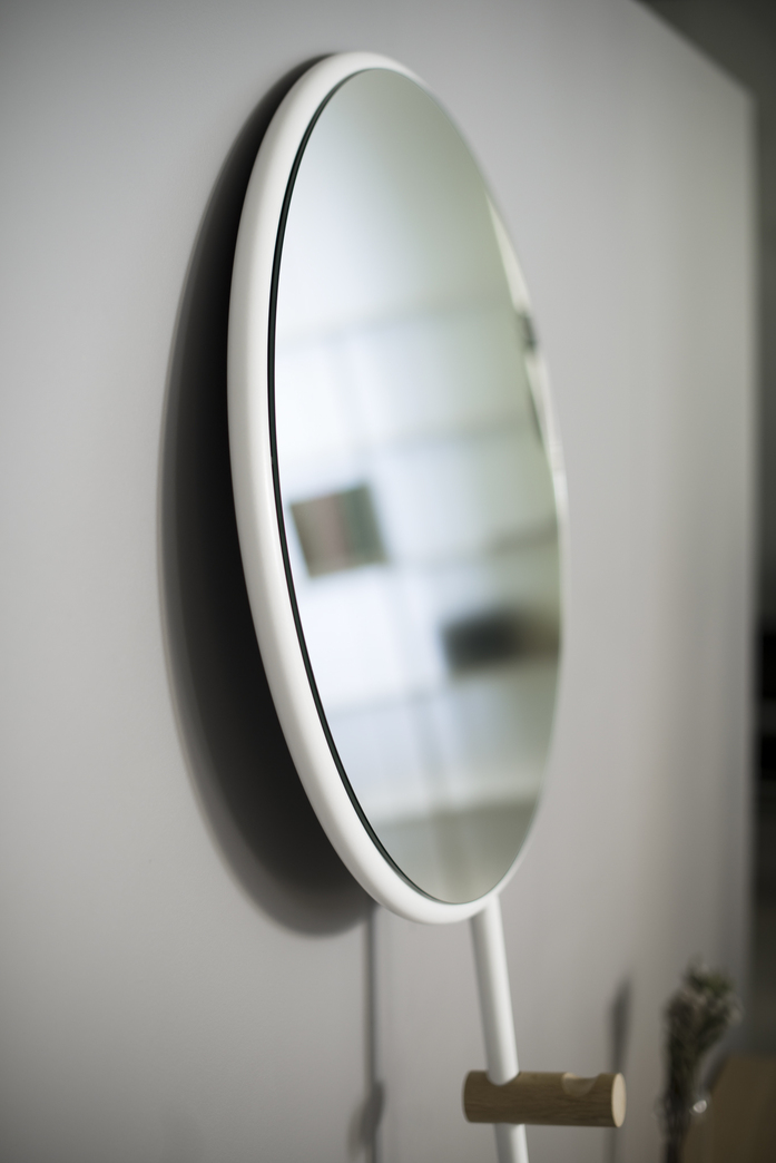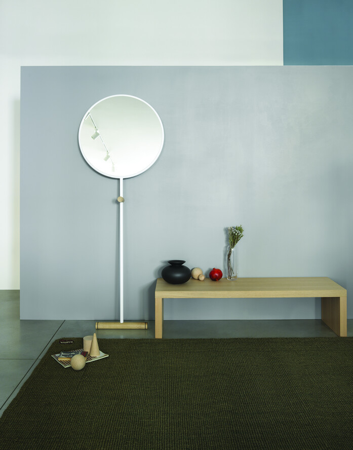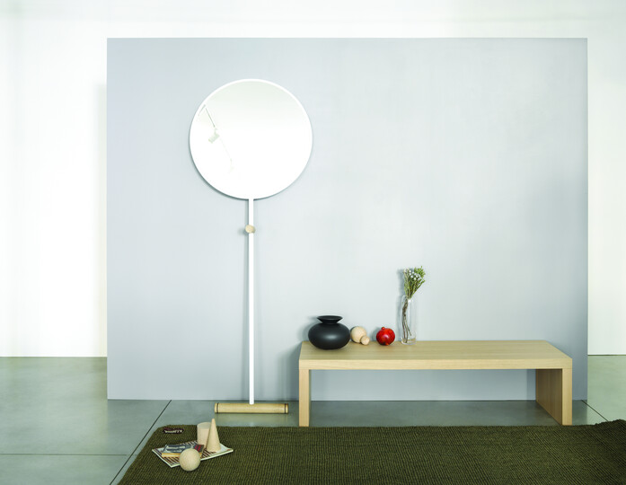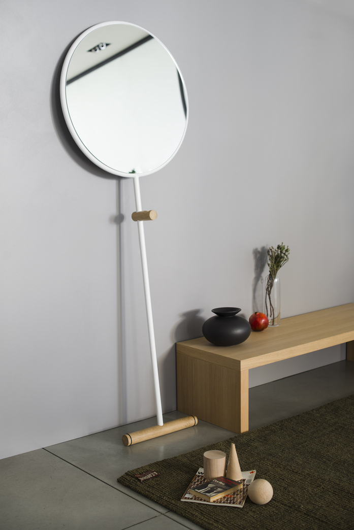 A floor standing mirror in a simple and effective elementary form, graphically displayed. Tubular in powder coated steel with solid natural oak details, gives the flexibility to be used in different areas inside the house.