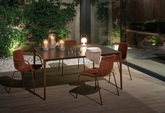 “In her curves and gentle shapes, the sober, light and versatile character is still maintained. This update includes a significant increase in comfort with improved ergonomics, in addition to high performance weather resistance, thanks to being woven with nautical rope on a painted stainless steel frame”.