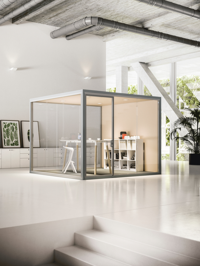 A room within a room, consisting of four modules of different sizes (interior dimensions W240 x L240 x H240 cm - W240 x L120 x H240 cm – W300 x L300 x H240 cm - W300 x L600 x H240 cm), creating islands within high-traffic spaces. The module is made using 4akustic sound-absorbent panels, which offer excellent acoustic performance, and it comes with different levels of customization, from a very simple solution to one with melamine flooring and a glass wall.
