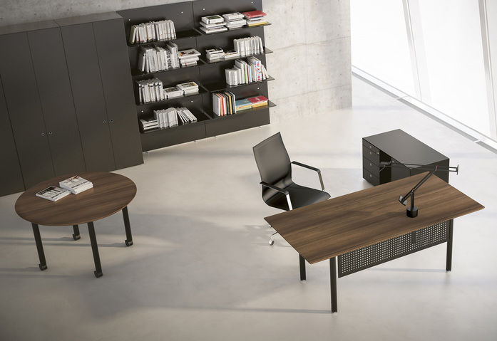 The Mèta collection allows for the creation of a complete interior design solution for the executive office, with character-filled simplicity: from the 60° curved table to the round table, useful for informal meetings, to the side cabinet, to compositions of storage cabinets that can be combined with different doors and bookcase panels.