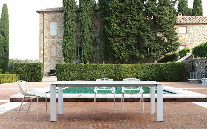 Sturdy and squared shapes for a pair of tables capable of satisfying all furnishing requirements, whatever the context. The Grande Arche collection, in painted aluminium, comprises a fixed garden table, an extendable garden table and a bench. Attractive colour contrasts can be achieved in the extending version: in addition to the standard extension (in the same colour as the table, housed under the table top), a second extension in a different colour is available, to create unexpected combinations.