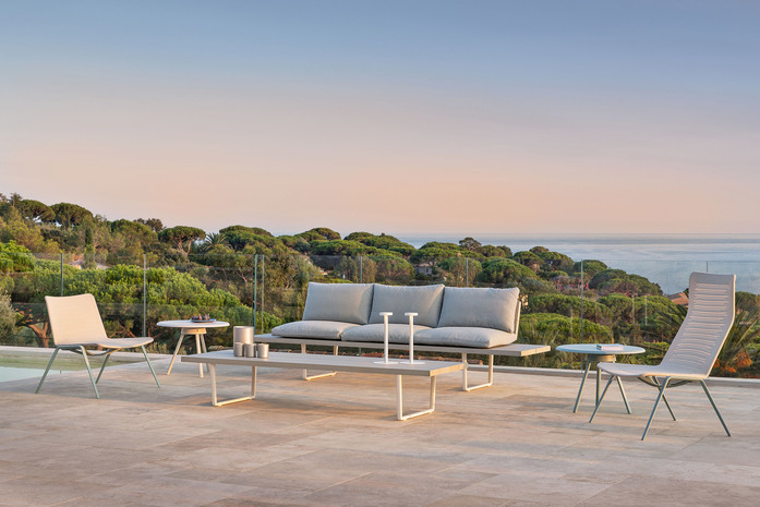 The Orizon collection includes perfectly matching dining tables, coffee tables, benches, sofas, lounge sofas and chaise-longues that are entirely made of aluminium: the frame is in die cast aluminium, whereas the extruded aluminium slats feature a special wood effect finish. The cushions - which are removable and also available in the waterproof version – add comfort to the benches, sofas and chaise-longues.