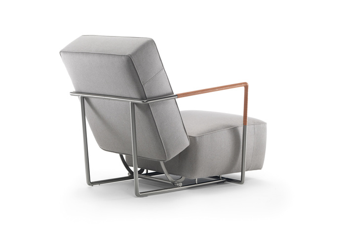 Inside metal frame with polyurethane padding with a protective fabric lining.Seat and backrest extendible thanks to a patented mechanical movement. Outside frame in satined or chromed metal tube. Upholstery Leather or removable fabric covers. It's possible to have the armrests upholstered in cowhide in colors: black, tobacco, natural, dark brown, grey, olive and russian red.