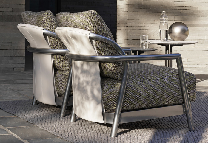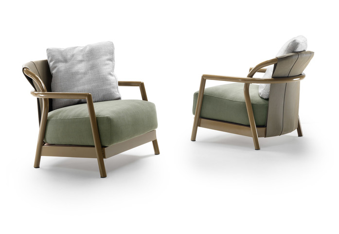 The outdoor version of the Alison armchair maintains the features of the original design intact, interpreting it in materials that ensure optimum performance out of doors. The curved structure of the armchair is in extruded aluminum with epoxy powder-coated finish in white, khaki green, wine red; or burnished or satin-finish aluminum, while the base is made of marine plywood. The backrest is in polyurethane rubber, in a color palette that ranges from earth tones to bordeaux and olive green, while the seat and backrest cushions can be upholstered in any of the fabrics from the outdoor textile collection. Thanks to their light weight, the Alison Outdoor armchairs can easily be moved. It is strongly advised that the respective covers be used to keep the Alison Outdoor armchairs in top condition and prolong their original beauty as much as possible.