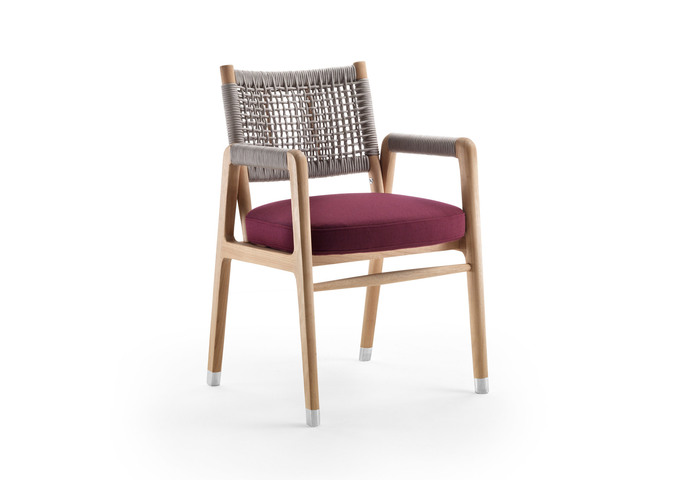 The seat is upholstered while the backrest is covered in refined, entirely hand-woven upholstery available in polypropylene cord or polyurethane rubber, both in an elegant palette of colors. The Ortigia family includes an armchair with armrests, an armchair without armrests that can be paired with a footstool and with a dining chair.